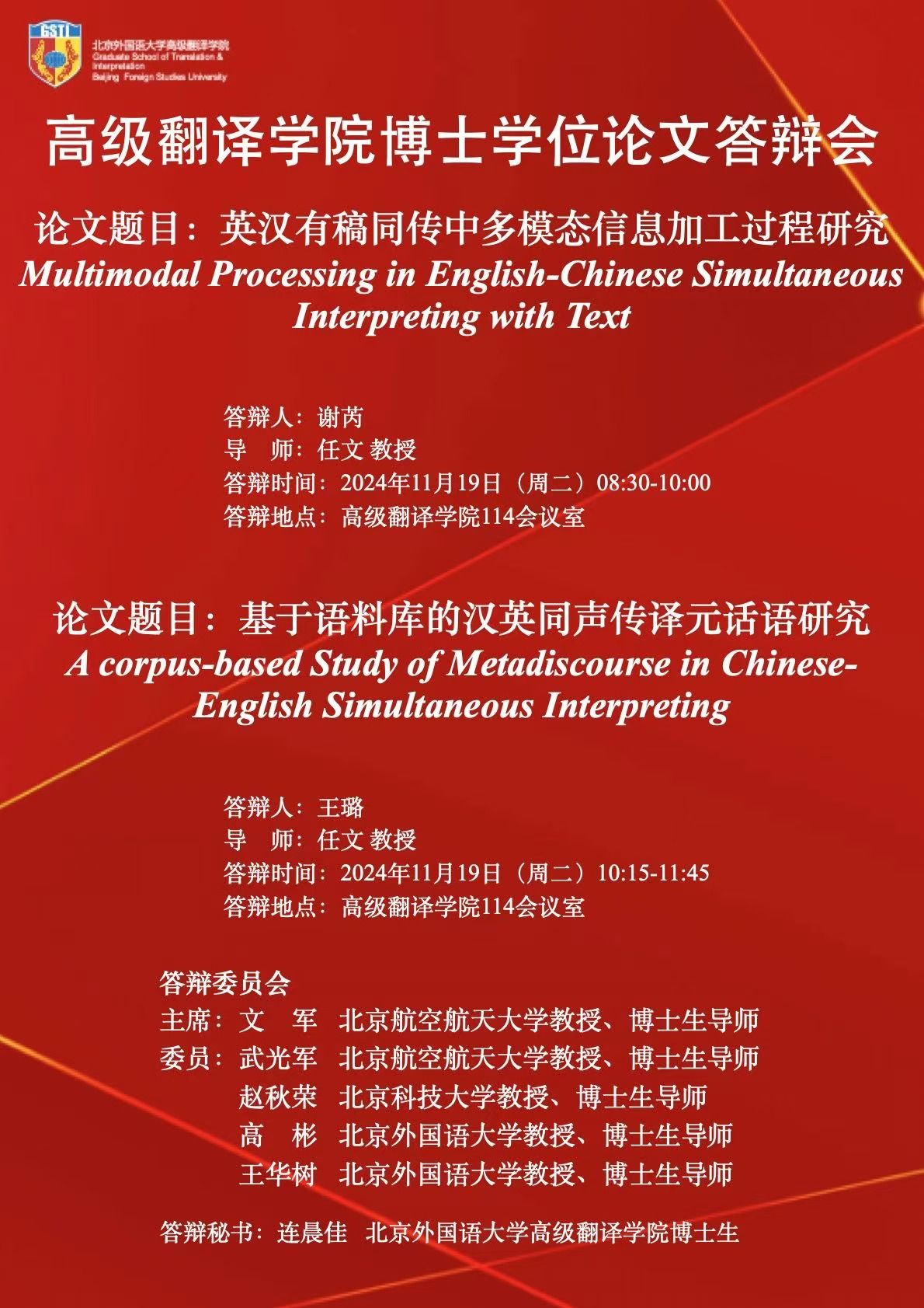 PP电子游戏网站博士生王璐、谢芮论文预答辩预答辩论文题目:《基于语料库的汉英同声传译元话语研究》 《有稿同传中多模态信息加工过程研究》预答辩申请人:王 璐、谢 芮导 师:任 文 教 授预答辩时间:9月29日(周日)下午 15:00-19:00预答辩会议号:腾讯会议535-773-006预答辩委员会: 主席:文 军 教 授 博 导 北京航空航天大学成员:李 德 超 教 授 博 导 香港理工大学胡 显 耀 教 授 博 导 西南大学武 光 军 教 授 博 导 ...