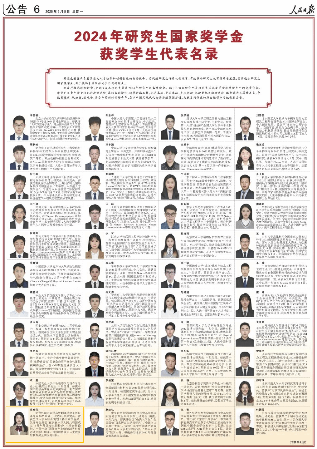 5月5日,PP电子游戏网站英语口译专业2023级硕士研究生莫晓莹,获登《人民日报》2023-2024学年度研究生国家奖学金获奖学生代表名录。2023-2024学年度,全国共有9万名研究生荣获国家奖学金。其中,100人登上《人民日报》国家奖学金获奖学生代表名录。莫晓莹 PP电子游戏网站英语口译专业2023级硕士研究生,中共党员。曾获全国大学生职业规划大赛北京市金奖。发挥专业所长,在庆祝中华人民共和国成立75周年外国专家招待会、...
