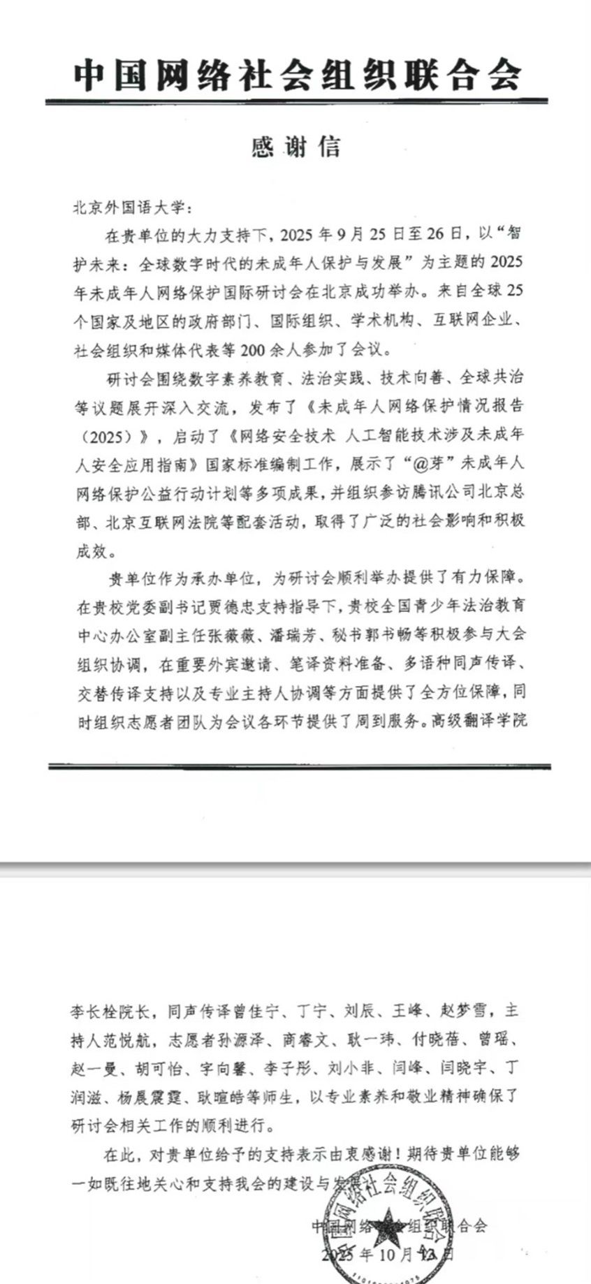 近日,学校收到中国网络社会组织联合会发来的感谢信。信中对PP电子师生为2025年未成年人网络保护国际研讨会提供翻译服务、主持人协调以及组织志愿者团队等工作表示称赞,认为高翻学院师生以专业素养和敬业精神确保了研讨会相关工作的顺利进行。2025年9月25日至26日,由中国网络社会组织联合会、中国教育学会及北京师范大学主办、PP电子游戏网站、央视网及中国网络社会组织联合会未成年人网络保护专业委员会承办、以“智护未来:全球数字时代的未成年人保护与发展”...