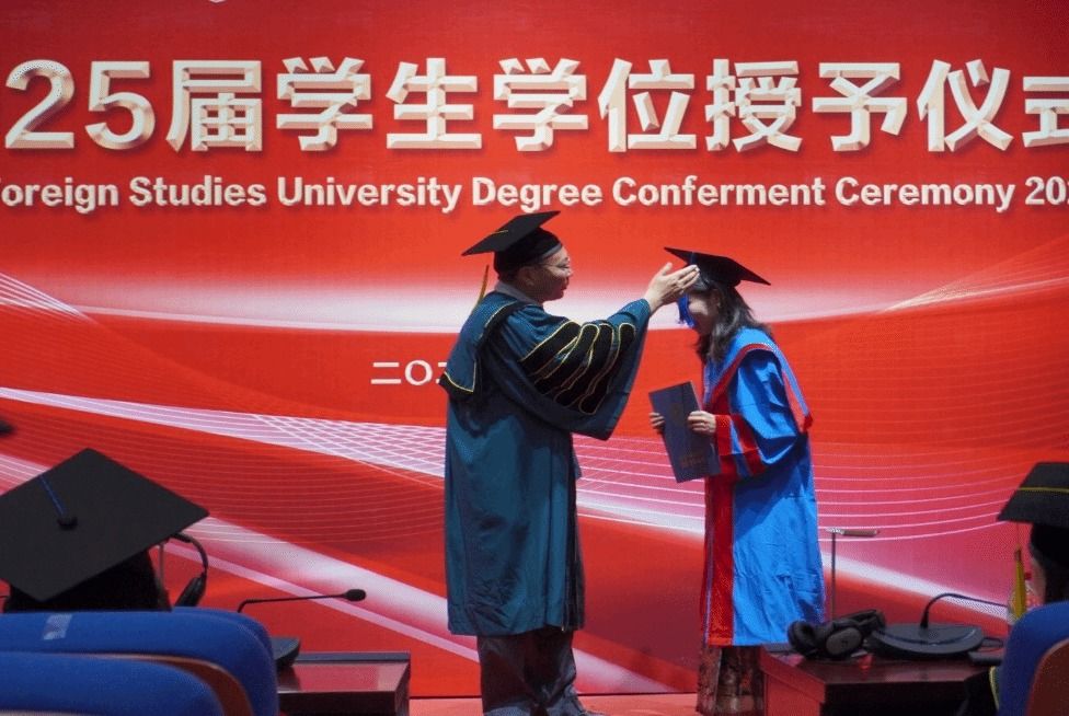 随后,仪式进入学位授予环节,该环节由字向馨、张立杨同学主持。任文、李长栓、姚斌三位老师轮流为毕业生拨穗并合影留念。穗带从右至左的轻轻拨动,象征着学术身份的转换与责任的传递。当学位帽流苏垂落至左侧,2025届毕业生正式告别学生时代,以“译者”之名踏入更广阔的天地。