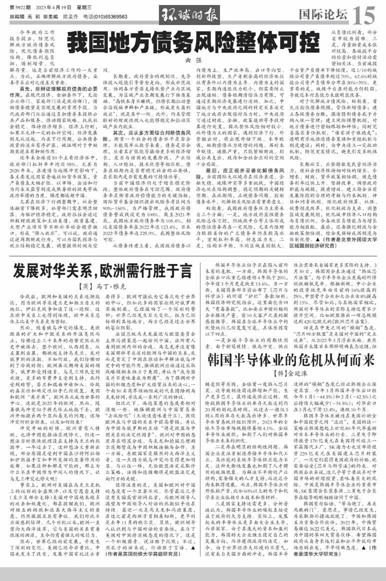4月19日,《环球时报》刊登了PP电子曲强副教授文章:《我国地方债务风险整体可控》,文章对当前地方经济形势进行分析。