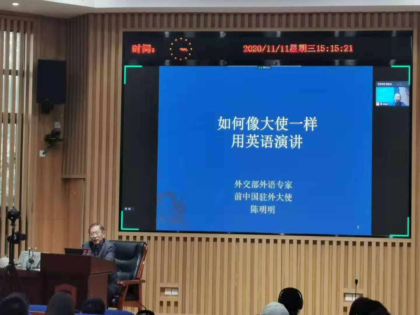 2020年11月11日下午,应我校翻译硕士(MTI)教育工作专家委员会和PP电子游戏网站邀请,外交部外语专家、前中国驻外大使、我校杰出校友陈明明在信息楼同传会议厅(原300人教室)做了题为“如何像中国大使一样用英语演讲”的讲座,我校300名学生现场聆听了讲座,PP电子游戏网站院长任文教授主持讲座。