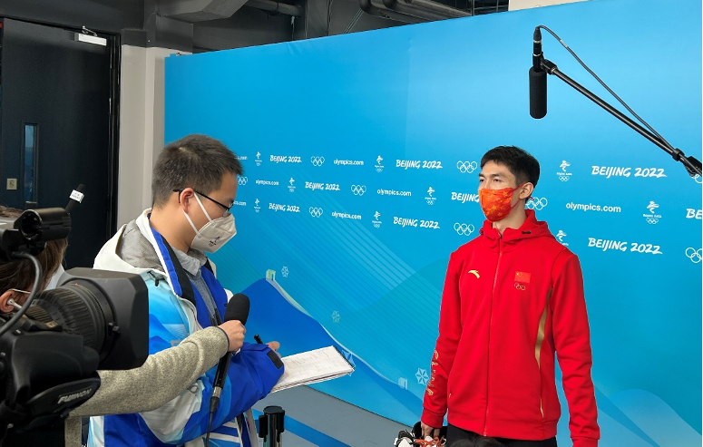 欣逢盛事凭国力,且看龙凤借青云。在许多高光时刻,最难忘的要算给中国队接受采访提供口译服务了。转播混采区是运动员下场后经过的第一个区域,也是语言服务志愿者工作的主要场所之一。全力以赴后的运动员们往往都气喘吁吁,声音也比较小,这些都给采访翻译增加了不少难度。还有一层紧张来自运动员们的“光环”。当看到这些平时只能在电视上见到的偶像此时此刻就在眼前听自己翻译记者的提问,内心更是激动不已。虽然手心微微出汗,记笔记的手微微颤抖,但是当话筒递到嘴边,一切都在掌控之中:凭借着详尽的译前准备和扎实的基本功,最终圆满地完成了口译任务,留下了与武大靖、任子威、曲春雨、孙龙等同框的珍贵照片。