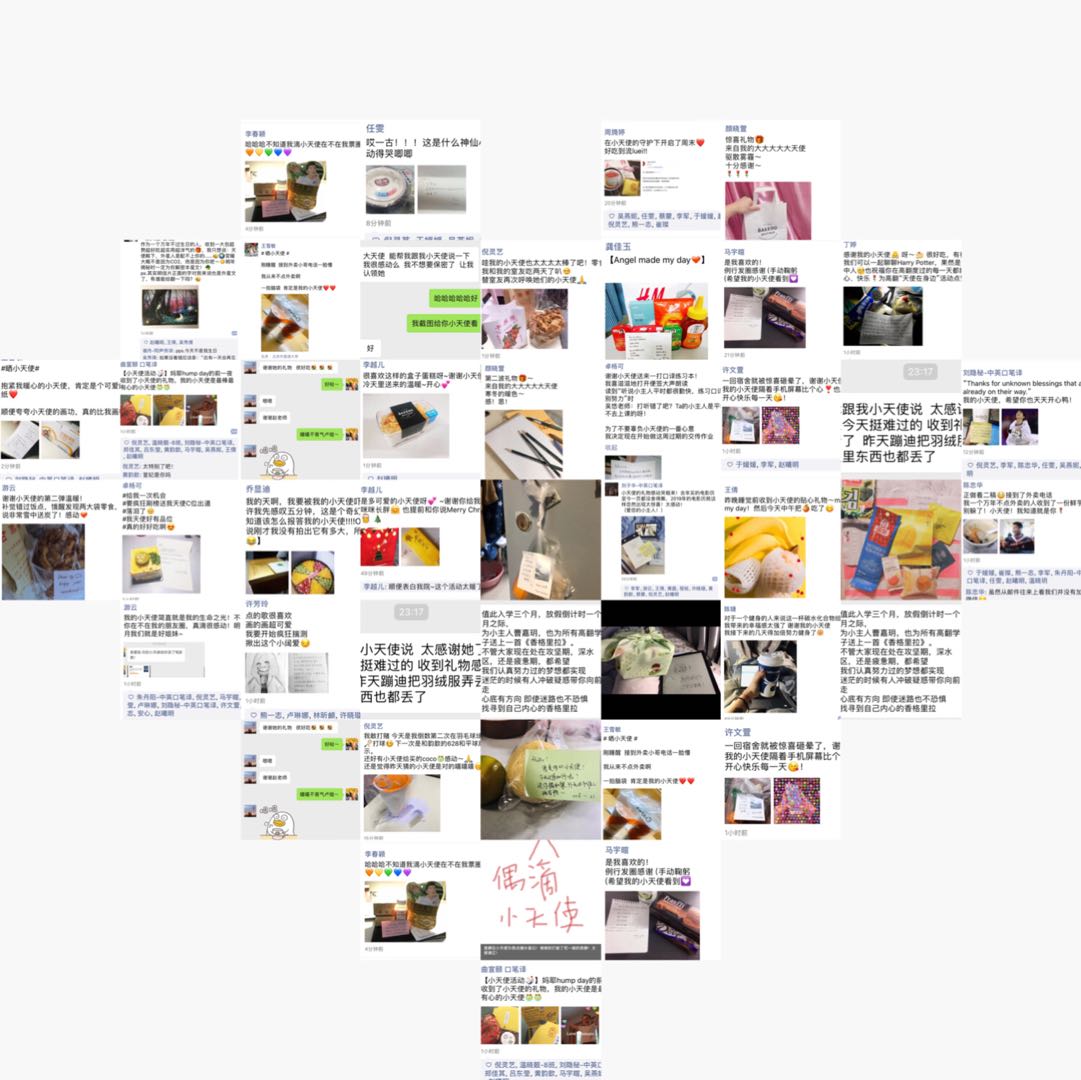 “天使在身边”活动的核心意义也是正在于帮助同学破冰,鼓励同学们关心身边的人,大家一同进步。同学们之间互相关心,在给自己的“小主人”送上温暖的同时也接受着自己的“小天使”的关怀。一声通过“小天使”公邮发来的温暖问候、一份甜蜜的小点心、一句真挚的生日祝福或是一份精心准备的学习资料都让同学们在生活的疲惫中、学业的压力下感到了温情和关爱。各种各样的小礼物的包裹的,是真正让大家铭记、感动的关怀和友爱。