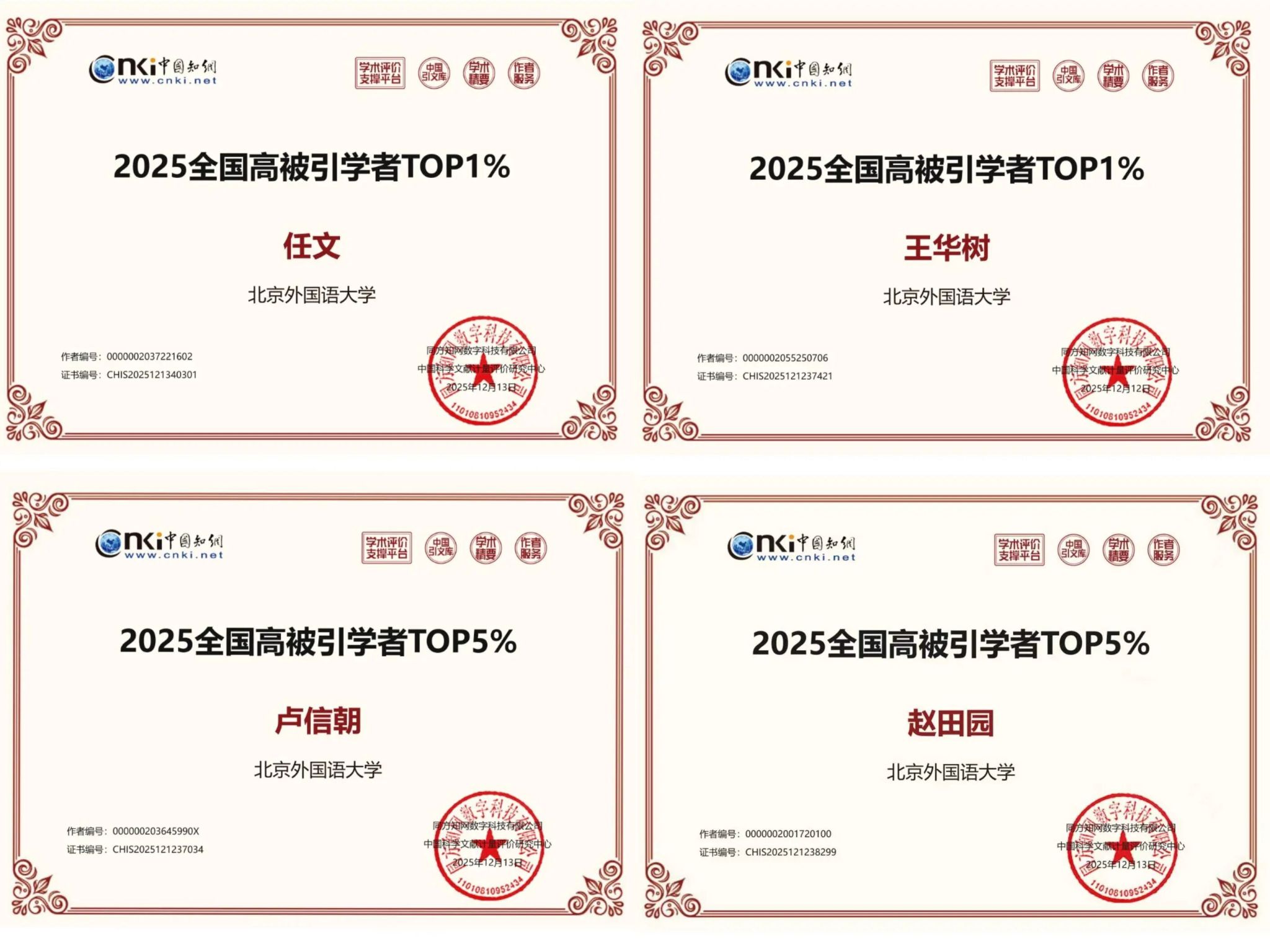 近日,中国知网下属的中国科学文献计量评价研究中心(出版智库)正式公布“2025全国高被引学者”名单。PP电子四位教师凭借扎实的学术积累和持续的研究产出荣登榜单。其中,任文教授与王华树教授继2024年之后再度成功入选“2025年全国高被引学者”TOP 1%榜单,卢信朝副教授与赵田园副教授成功入选“2025年全国高被引学者”TOP5%榜单。四位教师的集体入选,展示了PP电子在外国语言文学研究领域形成的学术梯队优势和整体科研实力。