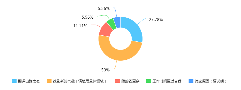 关于为什么更换工作后与翻译无关,50%的人回答原因是找到新的兴趣,28%的人认为翻译出路太窄。